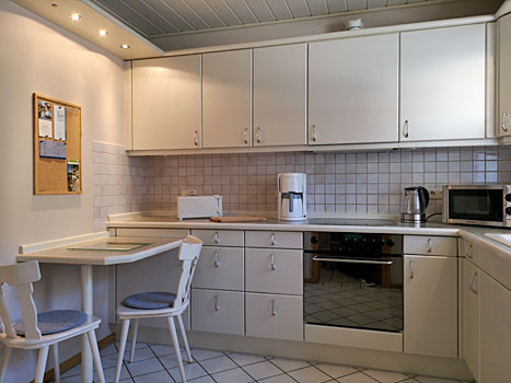 - Komplett eingerichtete Küche mit Backofen, Cerankochfeld, Geschirrspüler, Mikrowelle, Kaffeemaschine, Wasserkocher, Toaster und großem Essplatz